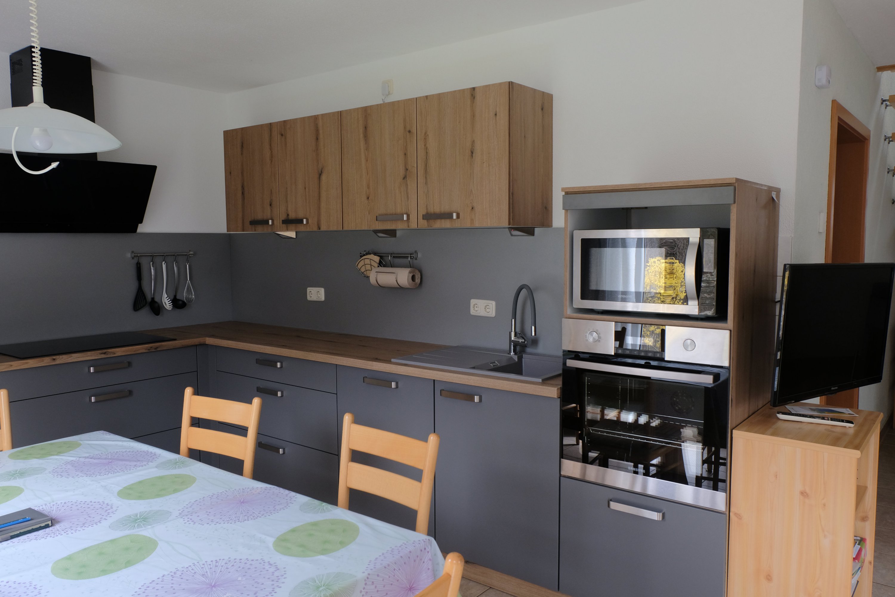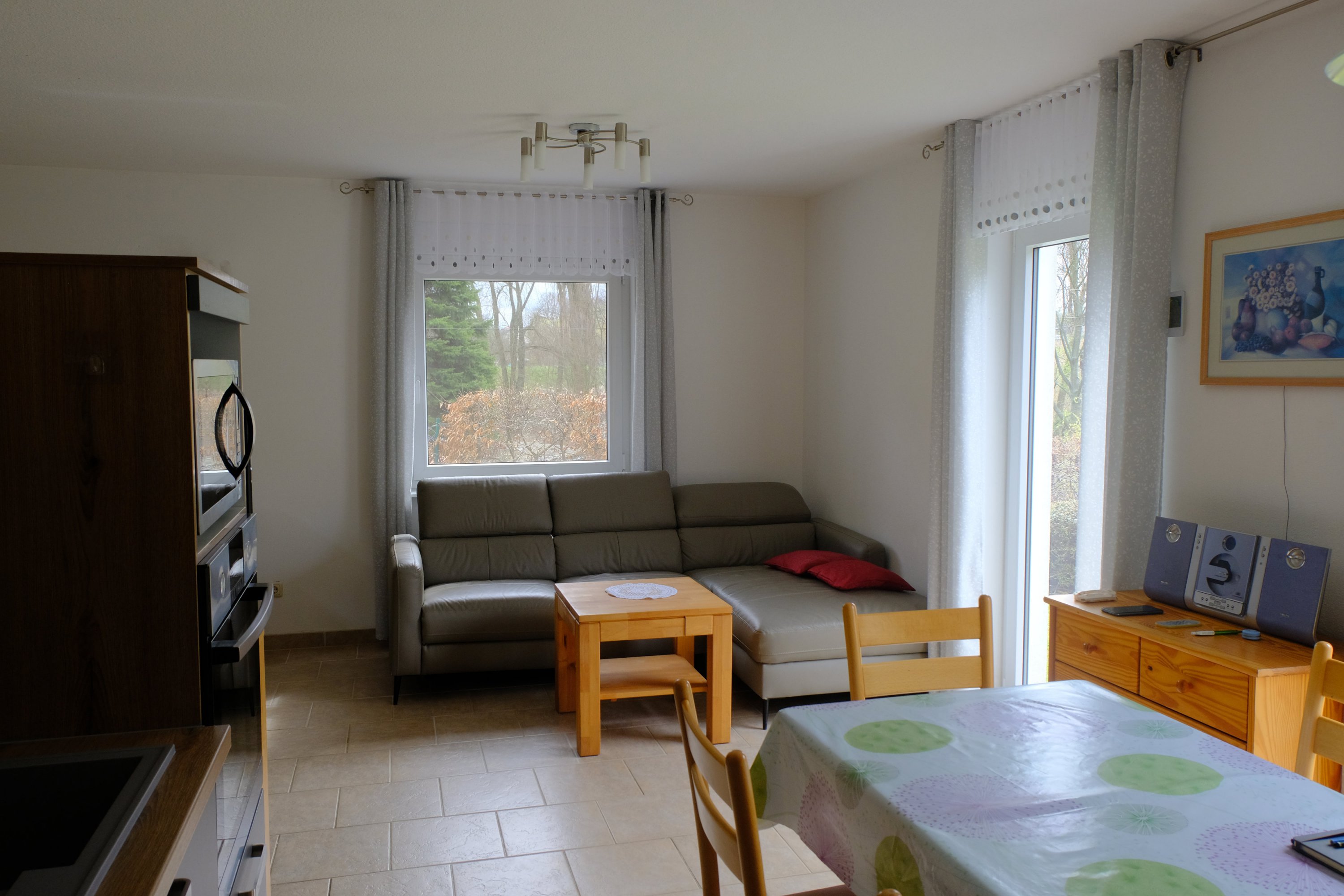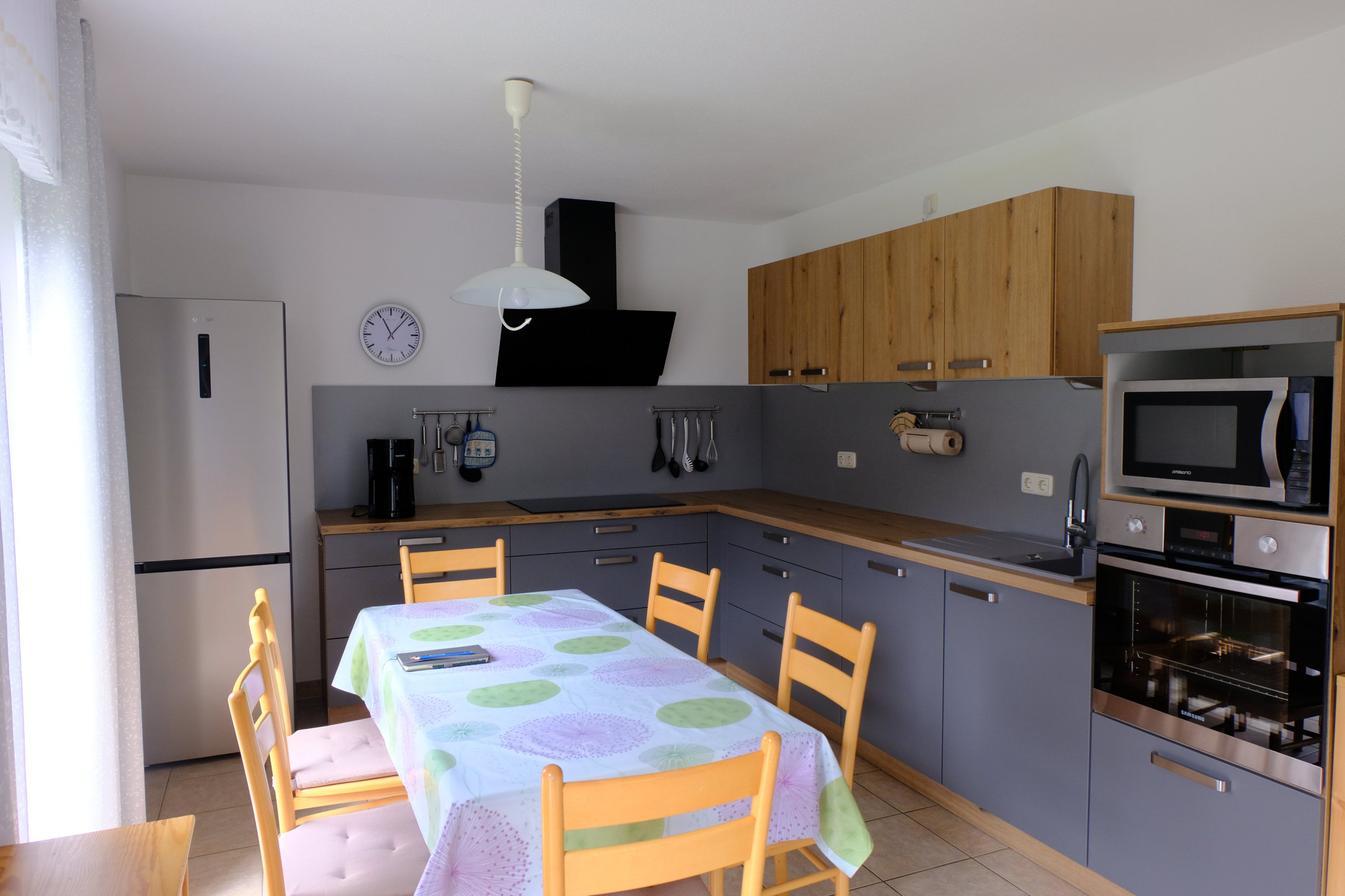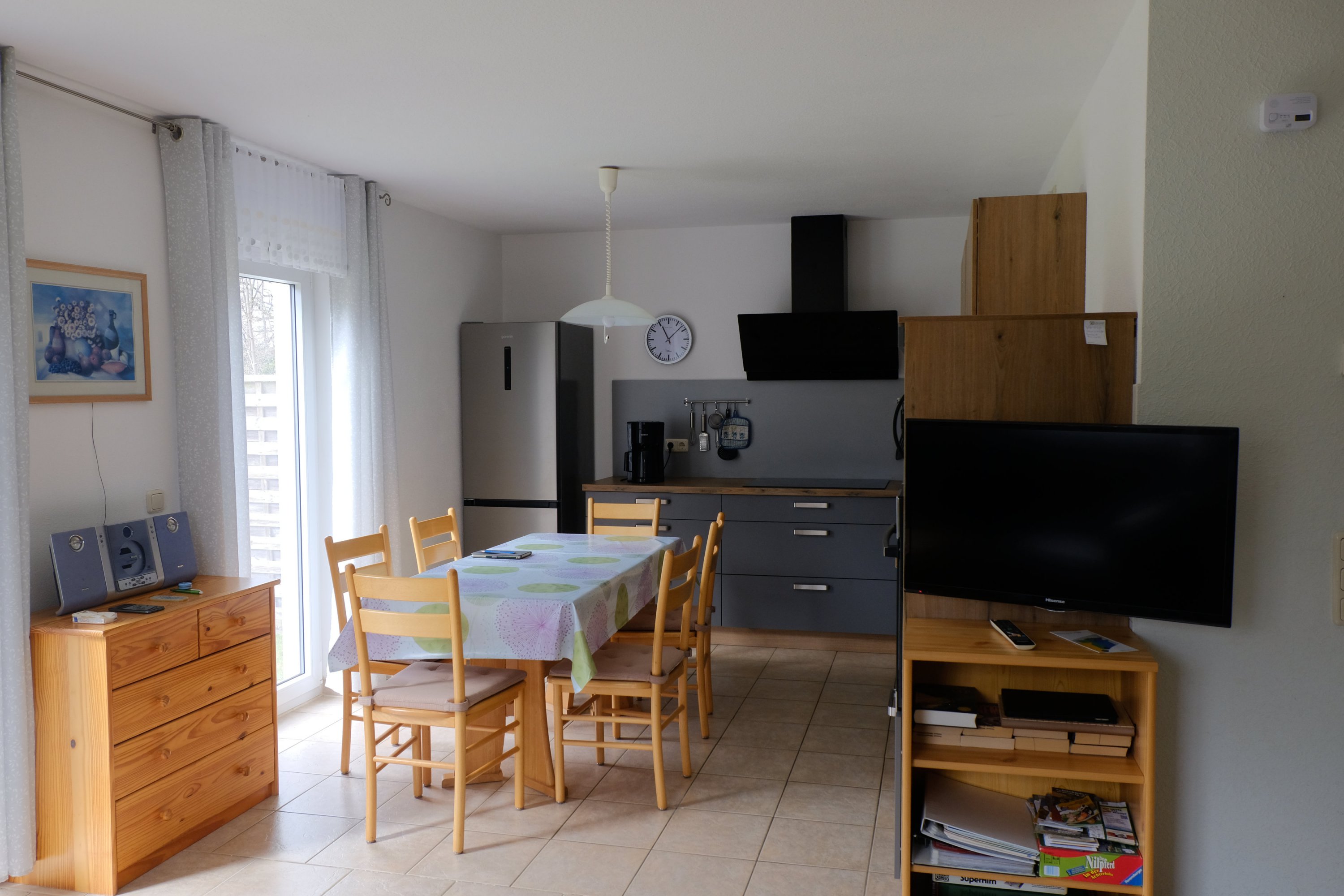 Die Küche ist ausgestattet mit einem Induktionsherd, integrierter Spülmaschine, Kühl und Gefrier-kombination, Backofen, Multifunktionsmikrowelle sowie separaten Wasserkocher, Kaffee-maschine, Toaster und weiteren Küchenkleingeräten. Der Essplatz bietet ausreichend Platz für 6 Personen. Der Wohnbereich ist mit einer Wohnlandschaft ausgestattet. An Unterhaltungselektronik bietet das Haus Ministereoanlage sowie einen multimediafähigen Smart-TV mit Satellitenanlage sowie schnelles Internet (Glasfaser). Das Bad ist ausgestattet mit  Dusche, WC, Föhn, Waschbecken und Handtuchtrockner. Im Hauswirtschaftsraum befinden sich Staubsauger, Kehrgarnitur und Waschmaschine. Das komplette Haus wird über eine Fußbodenheizung beheizt. In der kühleren Jahreszeit kann gerne auch der Kaminofen, der ausschließlich mit Holz bestückt wird, genutzt werden. Rundum sind die Fenster mit Insektenschutzgittern und Rolläden versehen.
