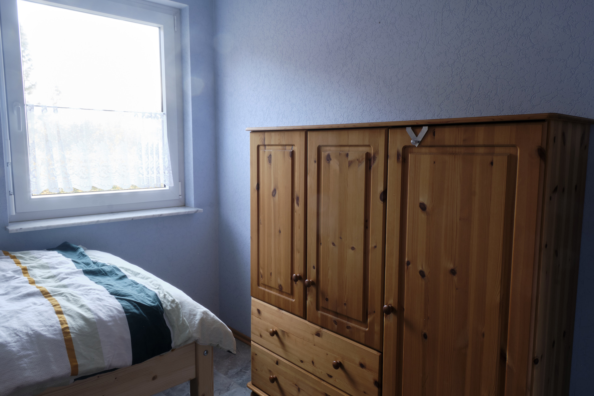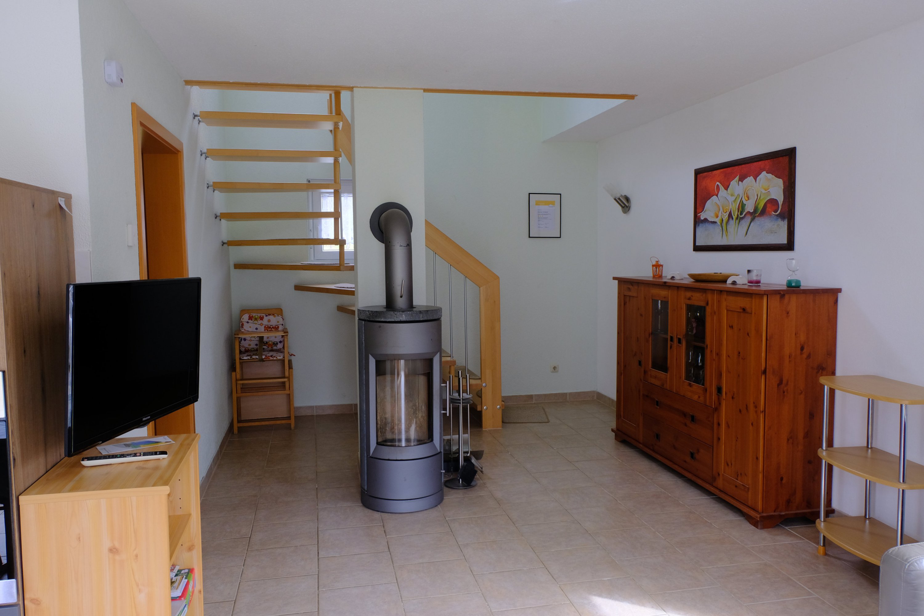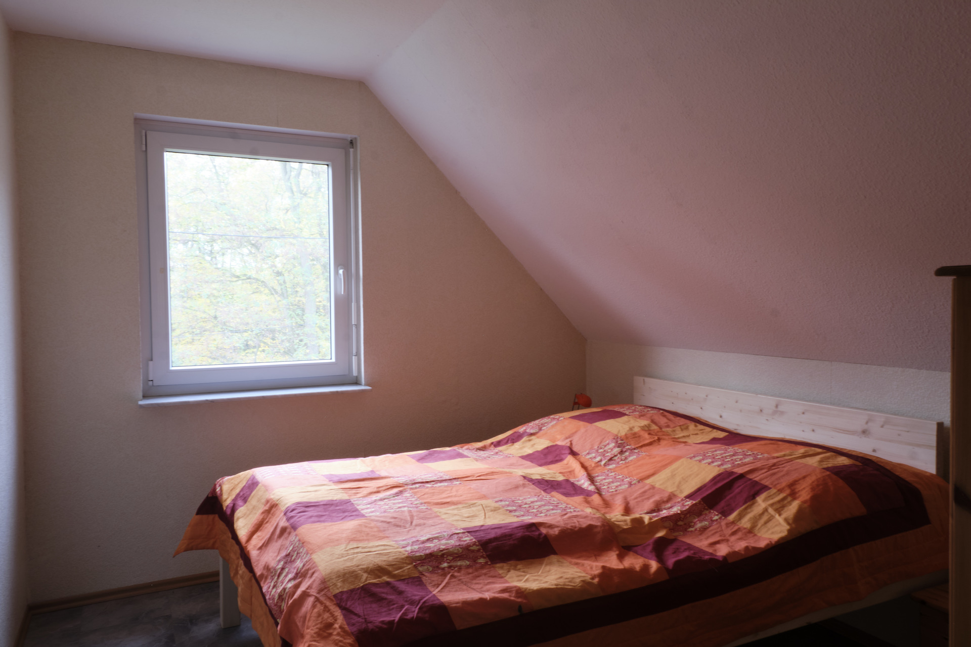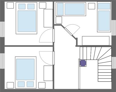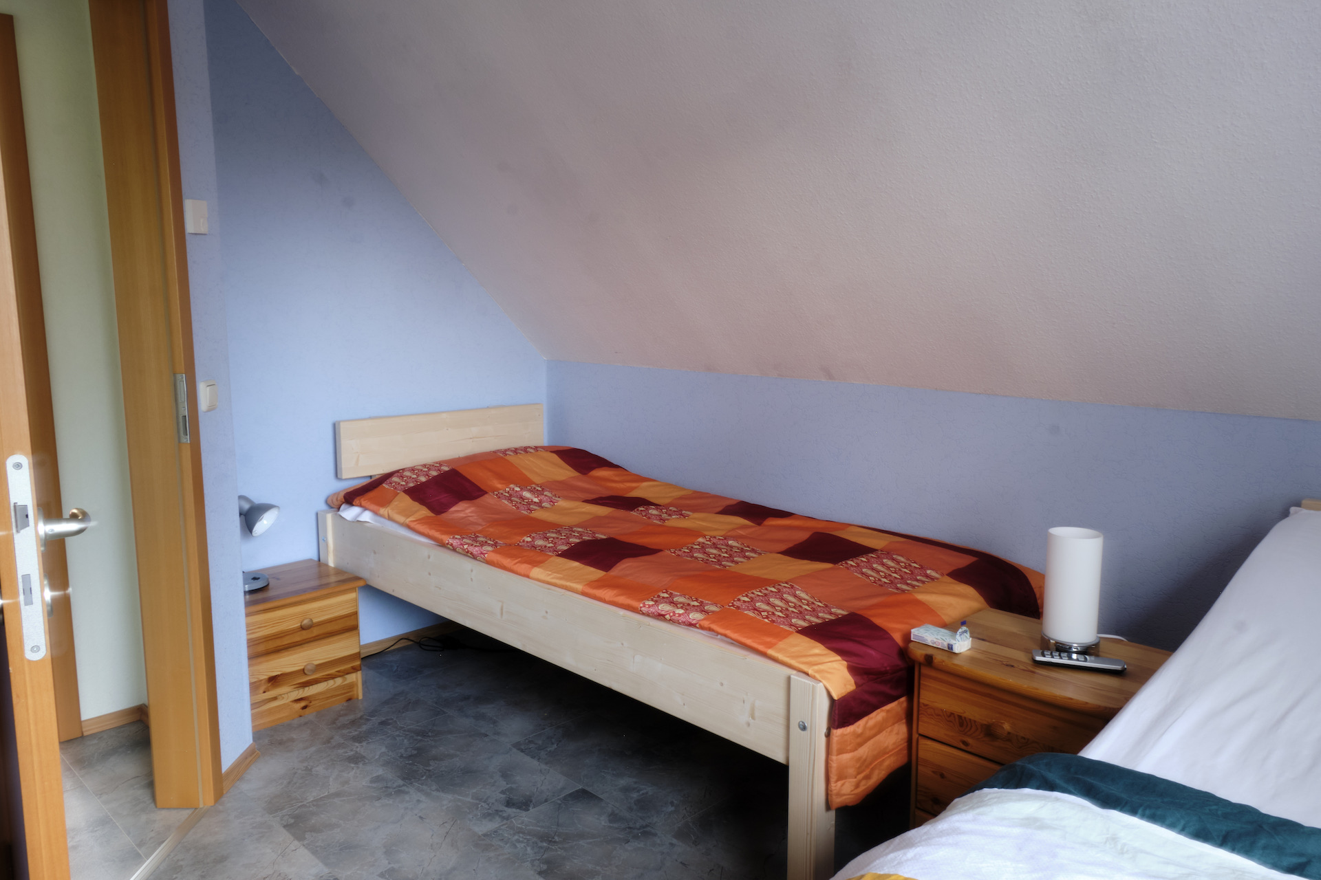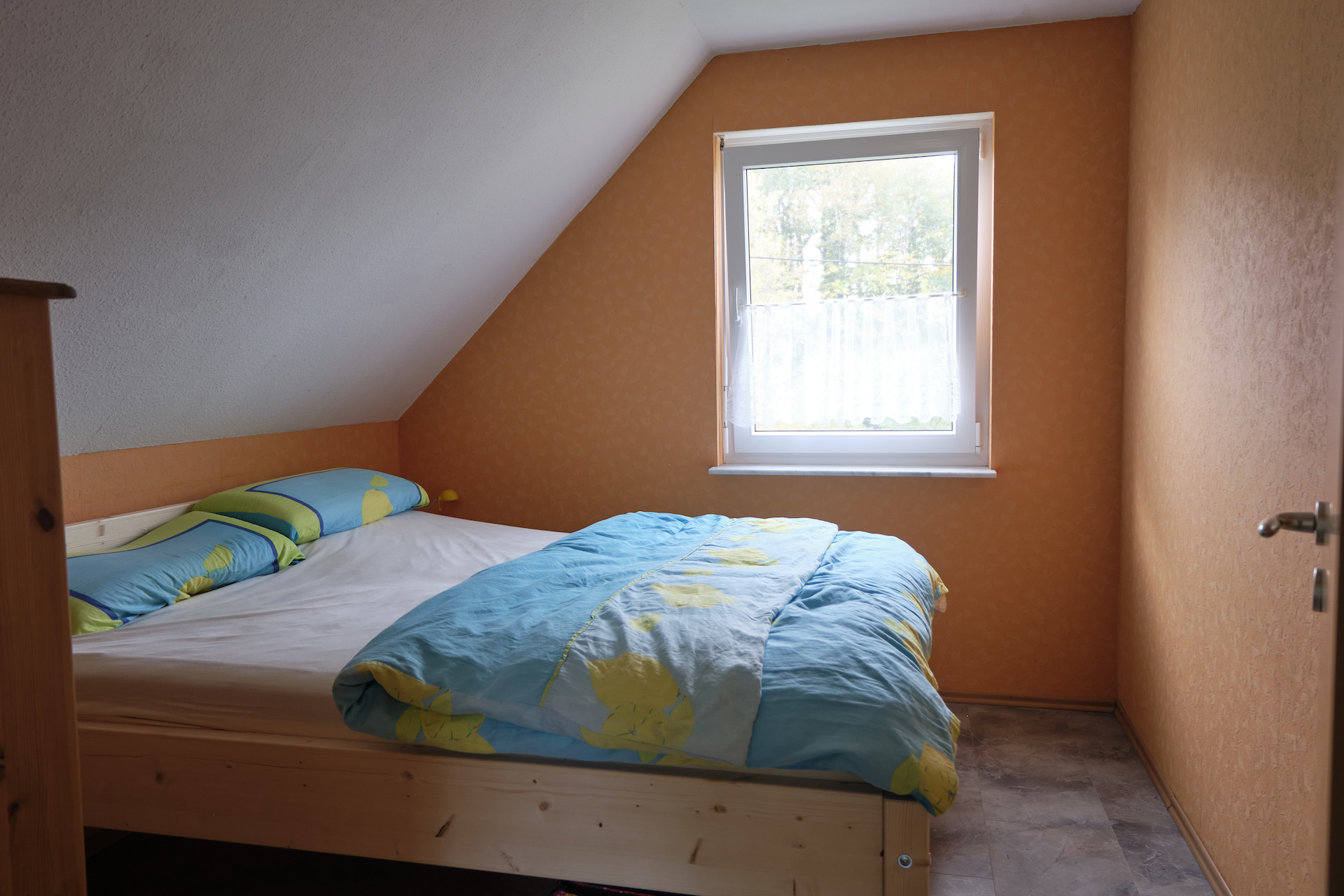 Von den drei im Obergeschoss befindlichen Schlafräumen sind zwei mit Doppelbetten und einer mit zwei Einzelbetten ausgestattet. Alle Schlafräume verfügen über Kleiderschränke und Nachttische. Zusätzlich sind ein Kinderreisebett mit Bettgarnitur (Kopfkissen und Zudecke) sowie ein Kinderhochstuhl, der sich in einen Kindertisch und einen Kinderstuhl verwandeln lässt, vorhanden. In dem Zweibetttzimmer stehen den Feriengästen ein Bügelbrett und ein Bügeleisen zur Verfügung.